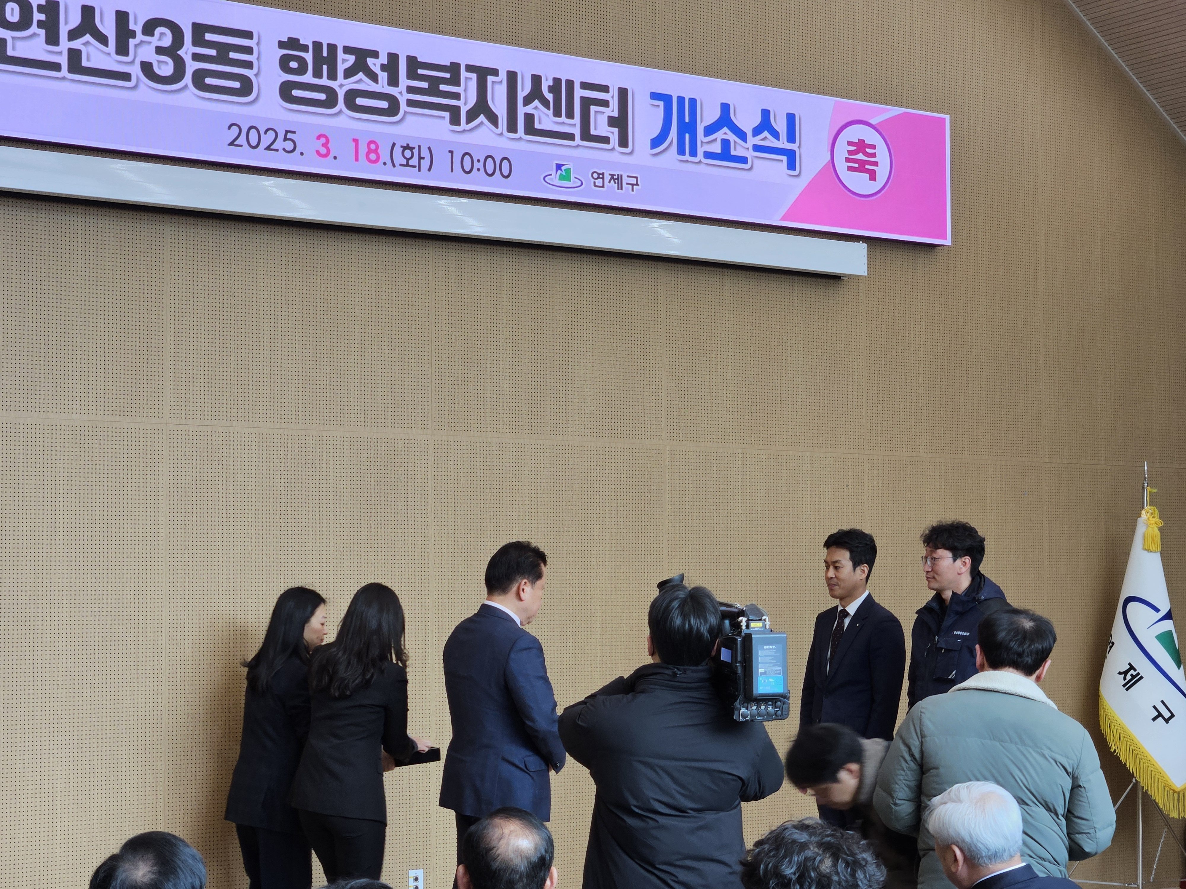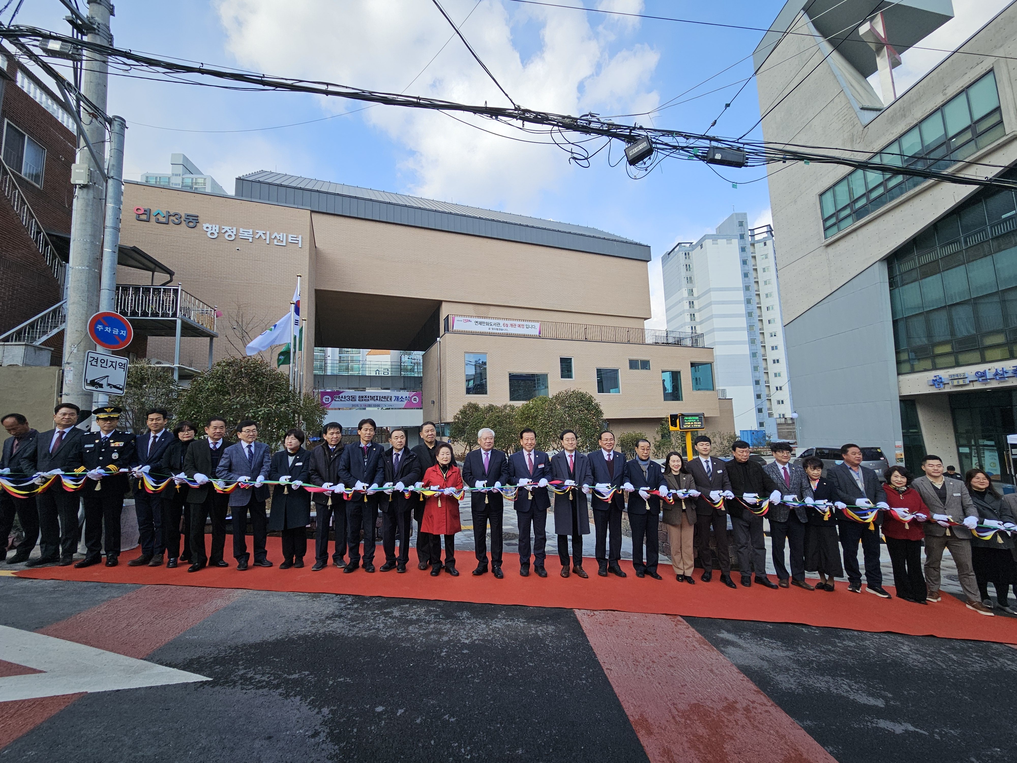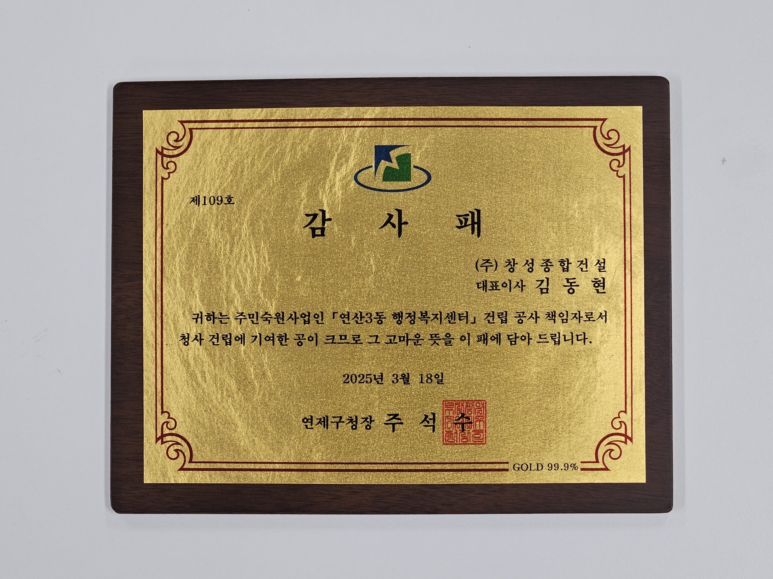 연제구(구청장 주석수)는 3월 18일 구청장, 국회의원, 구의장 등 구민 200여 명이 참석한 가운데 연산3동 행정복지센터 개소식을 개최했습니다. 이 날, 연제구(구청장 주석수)는 건립 공사 책임자로서 청사 건립에 기여한 공을 담아 창성종합건설(주)에게 감사패를 전달하였습니다.